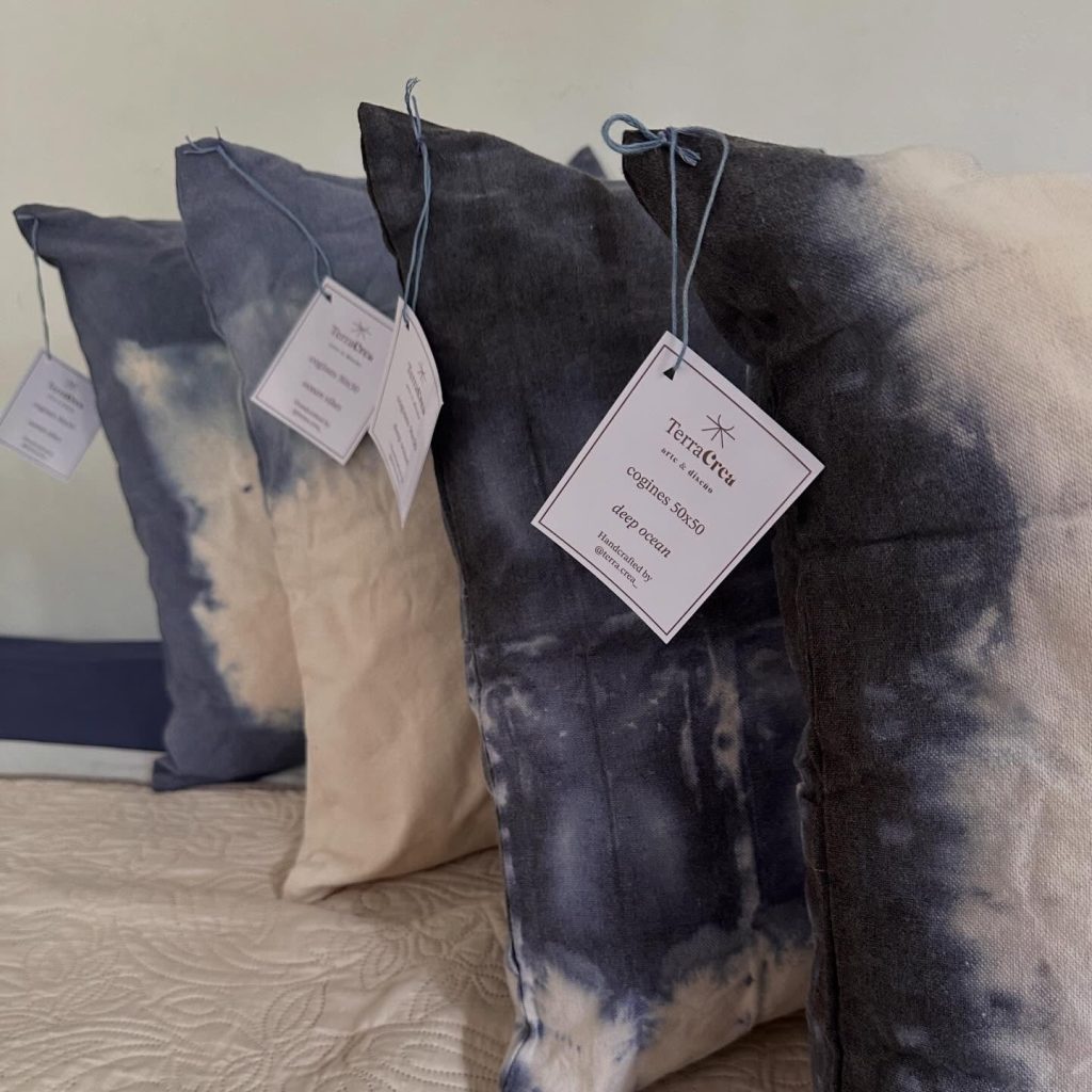 Para nuestra colección de cojines, utilizamos la técnica japonesa Shibori, que consiste en plegar, atar o comprimir la tela antes de sumergirla en el tinte. Esto crea patrones únicos pero buscando resultados específicos — ninguna pieza es igual a otra, sin embargo hay una intención previa de que quiero que aparezca al finalizar el tinte.